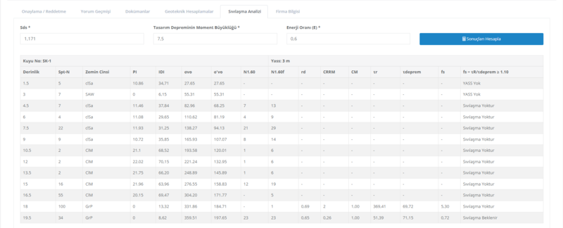 Sadece tek bir parametre girdikten sonra bakanlık yönetmeliğine uygun her kuyu için sıvılaşma analizlerini yapabilir ve karşılaştırabilirsiniz.